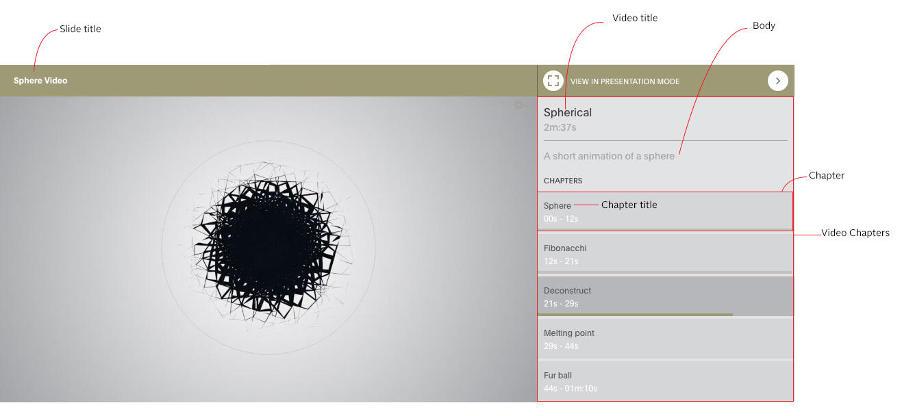 When adding a video to the left slide, you can add Video Chapters to the right side, and split your video into browsable chapters. You can add a Video-title and a short description of the video and as many chapters you need.