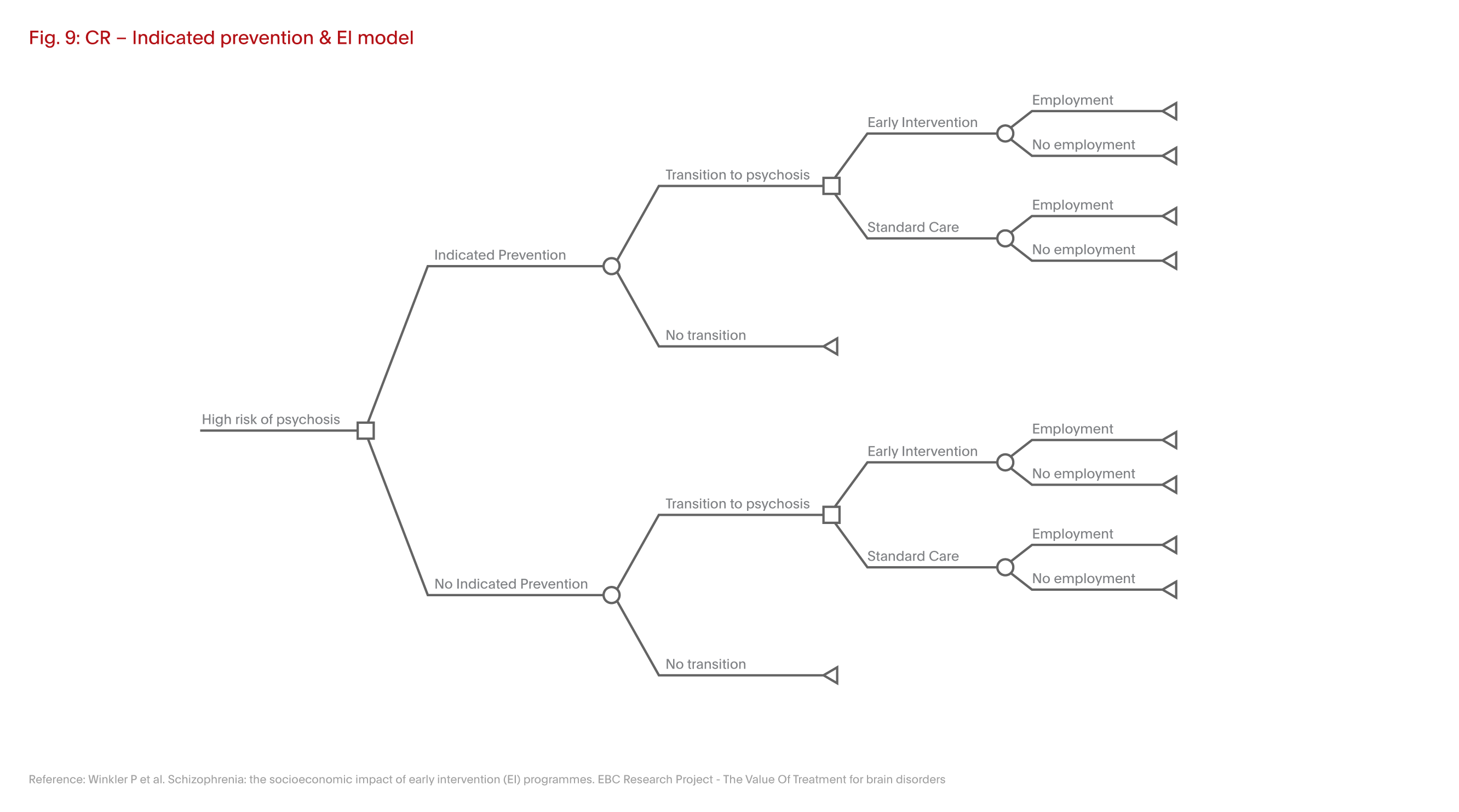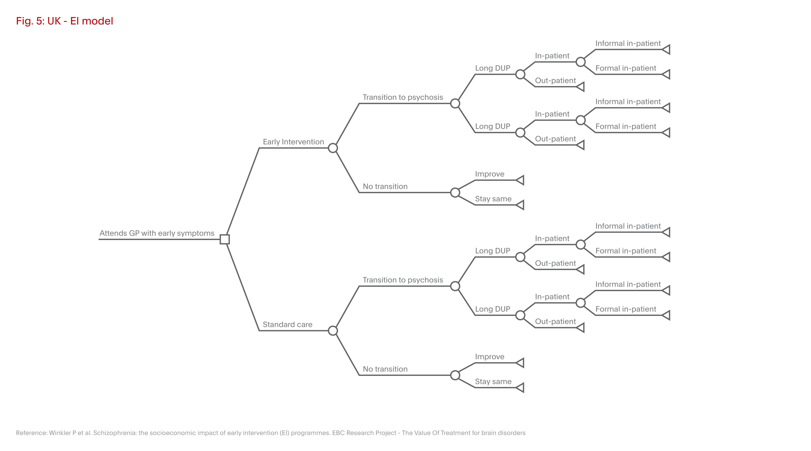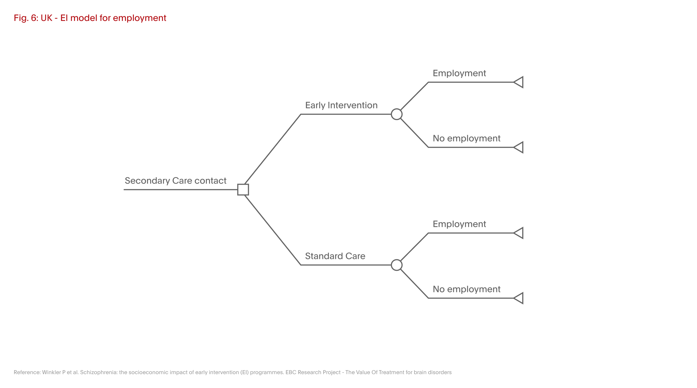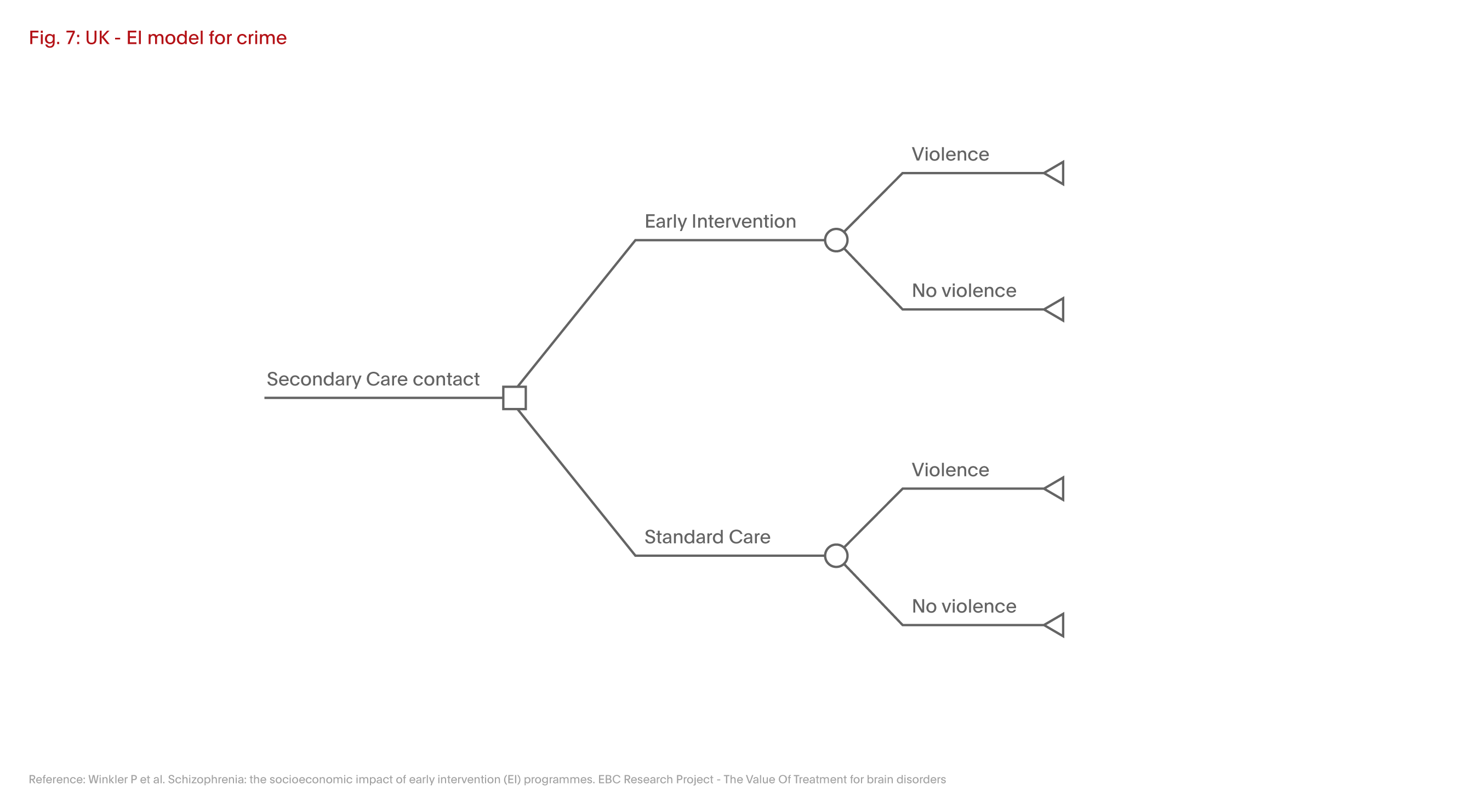 The EBC VoT Project assessed the economic value of early intervention in schizophrenia, ie intervention in the prodromal phase and early in first episode psychosis. The study compared the UK, where such intervention is available (and largely community-based), with the Czech Republic, where it is not.8 (Figs 6-10) This evaluation took into account not only the healthcare costs of early intervention but also the costs arising from in-patient hospital stay, unemployment and lost productivity, involvement in the criminal justice system, and need for housing.