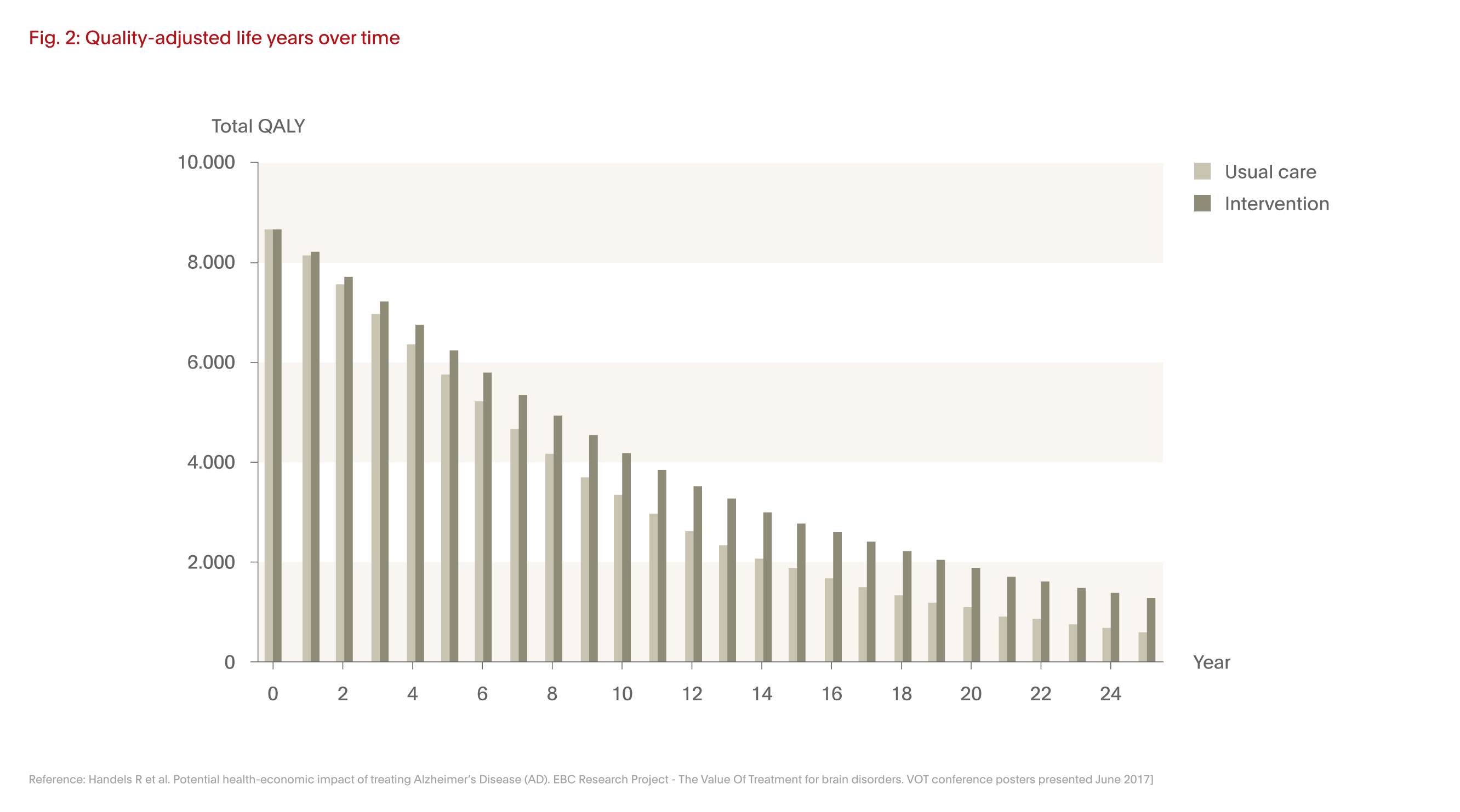 Compared with usual care, the disease-modifying treatment would increase the length of time people spent with normal cognition or MCI, and increase life expectancy (since mortality is lower in pre-dementia states) (Fig 1). As a result, the number of quality-adjusted life years (QALYs) were higher over time (Fig 2).3 Since active treatment resulted in slower progression, healthcare costs were also reduced when compared with current care.