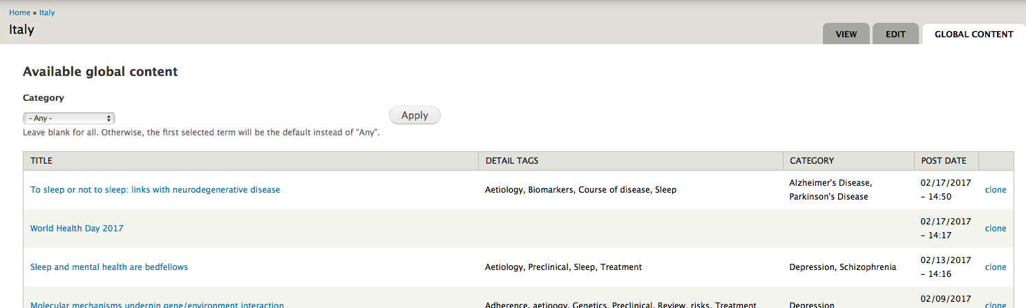 The Global content tab leads you to an overview of all the content available to you from the global site. Choose the content you want and hit the clone button to the right as you can see below.