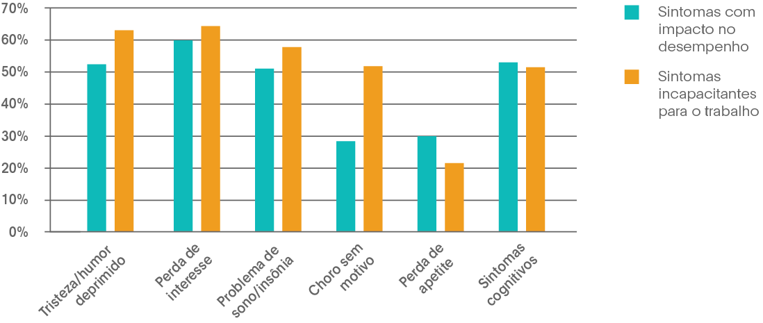 Os sintomas incapacitantes que mais afastaram o trabalhador de suas atividades foram: perda de interesse por atividades rotineiras, tristeza ou humor deprimido, problemas de sono/insônia, choro e sintomas cognitivos. (Quadro 2) Embora os sintomas cognitivos tenham tido baixa identificação com a depressão, mais da metade dos trabalhadores relatou que tais sintomas resultaram em licença médica por depressão.